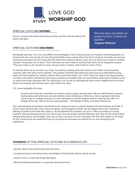This Bible study gives a holistic look through Scripture at the Worship God outcome. Engage thought provoking questions for individual reflection and then discuss them in your Life Group or Spiritual Running Partner relationships.